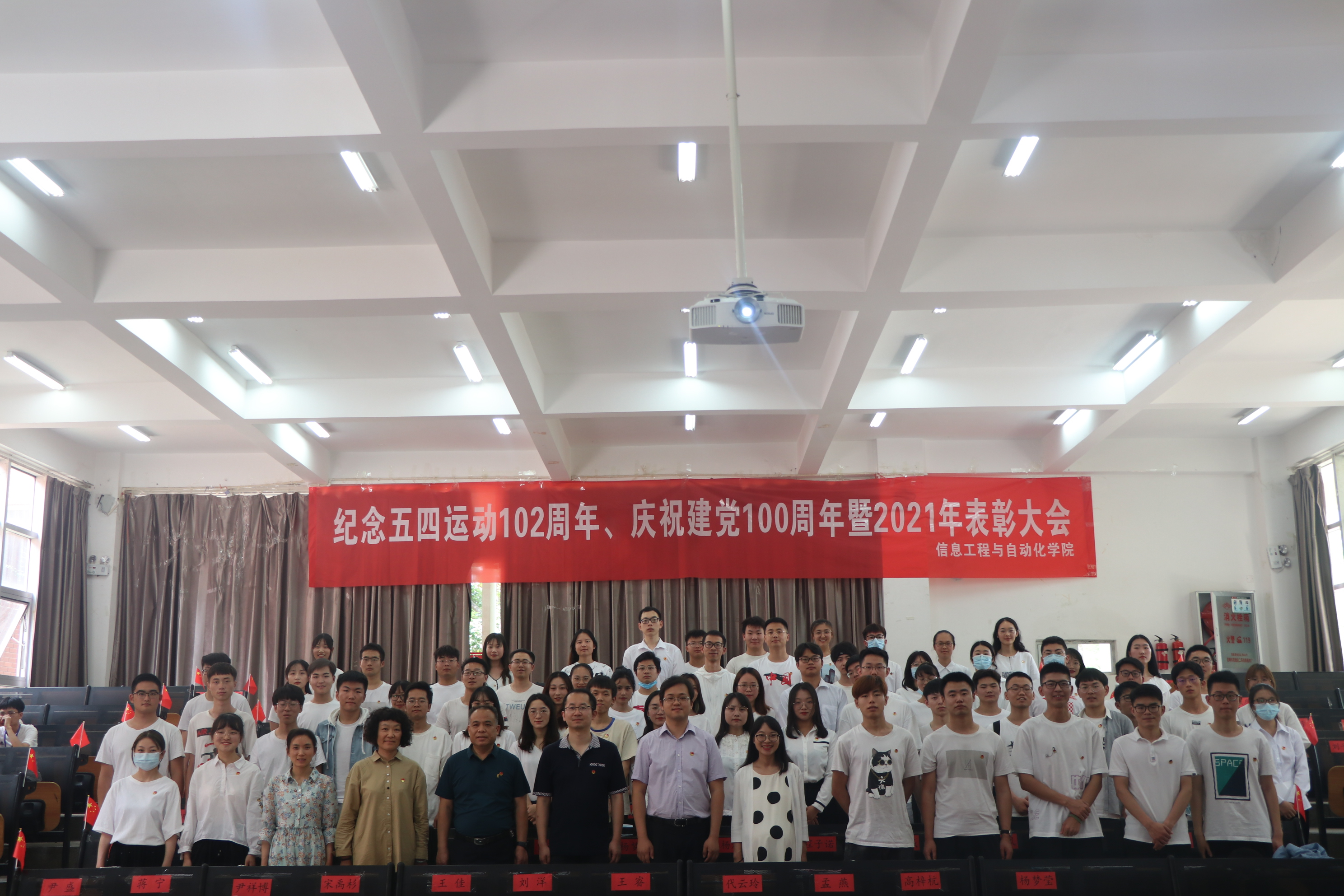 纪念五四运动102周年、庆祝建党100周年暨2021年学生表彰大会在信自楼100报告厅召开。信自学院副院长沈韬、党委副书记周鹭、工会主席赖华、综合办主任汪涛、研教办主任陈玮、教务办副主任罗艳出席了本次大会。信自学院全体辅导员、各班团支部书记、学生组织主要学生干部、受表彰先进集体及先进个人代表共计150人参加了本次大会。