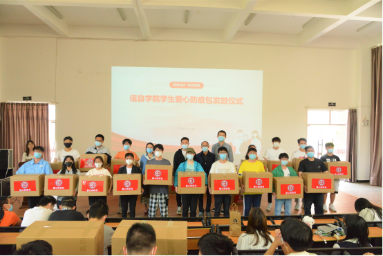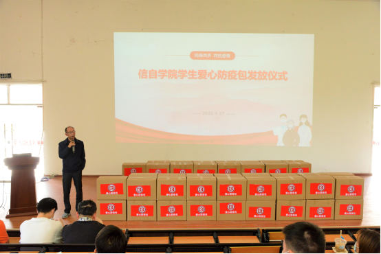 为本科学生采购了“爱心防疫包”,并于2022年4月27日中午在信自100举行学生爱心防疫包发放仪式。仪式由学院党委副书记周鹭主持,学院党委书记齐毅、全体辅导员、本科学生代表参加本次活动。