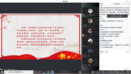 最后全体参会成员完成了“我为学校建设‘双一流’和支部工作建言献策”活动。参会同志就以上两点认真思考,积极分享观点,成员支部党员均提出了有意义的建议。关于“双一流”建设,同学们大多提出了结合国家战略要求,注重创新发展,形成昆工特色的建议。关于支部建设,同学们提出了多开展线下活动以达到增强支部成员凝聚力,加强支部分工,明晰支部组织结构的建议,计算机学生第一党支部认真听取了党员同志的建议,争取向“一流支部”不断靠近。