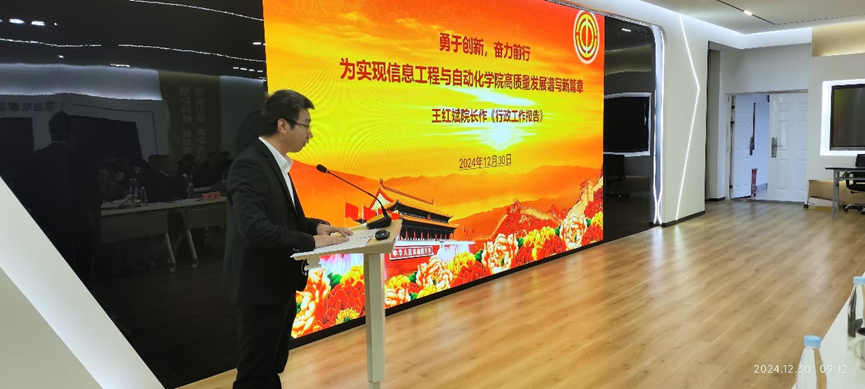 学院党委书记齐毅主持大会,会场气氛热烈而庄重。在庄严的国歌声中,第一次全体会议正式开始。学院院长王红斌作了《行政工作报告》,全面总结了学院一年来的教育教学、学科建设、科学研究、社会服务等各项工作及建设发展取得的成绩,并深入剖析了当前面临的挑战与机遇。同时,他还向大会作了《学院经费使用情况报告》。