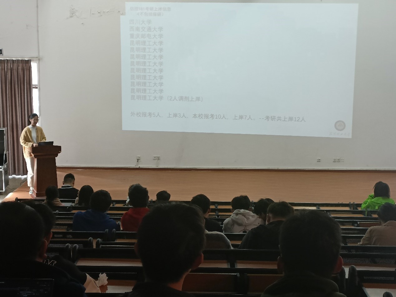 活动中,朱铠迪从为什么考研、考研整体流程、考试科目冲刺技巧、备考心态等方面出发进行经验分享,使同学们对考研冲刺阶段有了进一步的认识和了解;郭涵强调了信息获取与资料搜集的重要性,并向同学们分享了自己考研调剂的经验;刘召祥为同学们分析了考研趋势,提供了学习建议和心态调整的方法,坚定了同学们考研的信心。