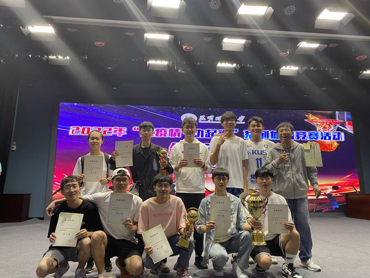 学子在“抗疫情、动起来”系列竞赛活动中奋勇拼搏,喜获佳绩。其中,男子“三好杯”排球赛勇夺第一,女子队获第三名;“昆工杯”足球赛获第二名;“三好杯”3x3篮球赛一组第五名、二组第六名;乒乓球混合团体赛一组第二名、二组第七名;游泳比赛获第八名;"LYB"羽毛球获第四名;网球比赛精英组女子单打王雯昕同学荣获第三名,刘星雨同学荣获第五名;男子单打李哲贤同学荣获第一名,但奇逊同学荣获第六名,邓发荣同学获第七名;网球比赛阳光组女子单打余艳超同学荣获第三名,男子单打郭云川同学荣获第一名,赵伟枫同学荣获第四名;力量三项比赛飞家龙同学荣获男子第一名,谢欣阳同学荣获男子第二名。最后,颁奖仪式在一片热烈的掌声中结束。