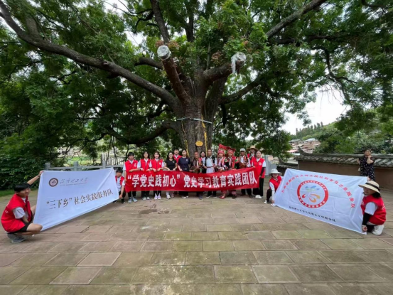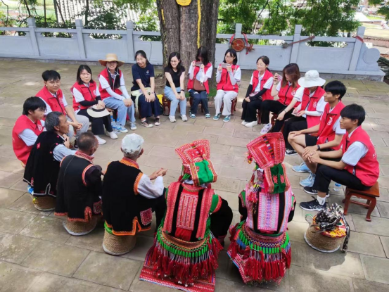 实践团队在李副镇长的引导下来到了位于石屏县哨冲镇,通过对花腰彝族刺绣作品,农具参观,非遗文化传承人传授经验知识以及李副镇长和指导老师的讲解下,实践团成员对于花腰彝族特色文化有了清晰的认识。孙正克等五位各级非遗传承人与实践团师生围坐在百年古树下,互相交流非遗文化的传承之道,感叹非遗传承的不易。由传承人讲述自己故事、实践团学生发表听讲后感悟、指导老师提出自己的建议。随后,实践团队又来到龙朋镇恒昇小学,参观云南人民自卫军第四支队陈列室,共同回顾了云南人民自卫军第四支队的筹建过程,并且了解到“龙朋暴动”始末,革命先辈事迹,石屏地区革命历史。
